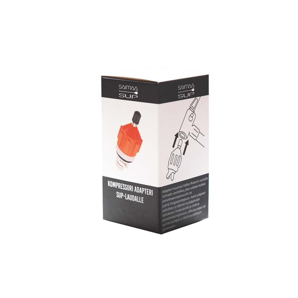 Kätevä adapteri sup-lautojen täyttämiseen ilmakompressorilla. Adapteri on yhteensopiva kaikkien sup-lautojen venttiilien kanssa, joissa Halkey Roberts venttiili. Sup-laudan kompura adapterissa on normaali autonrenkaan venttiili, johon sopii niin huoltoasemien kuin kotikäyttöisten kompuroiden suuttimet.